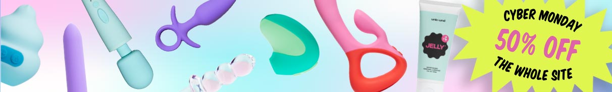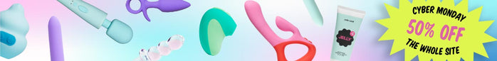 Navy blue silicone butt plug called Nudge laying on model wearing a purple one piece bathing suit